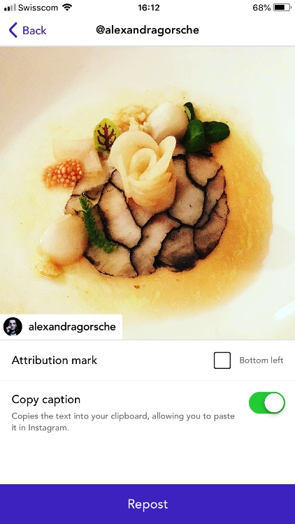 Klicken Sie auf Repost, wählen Sie «In Instagram kopieren» aus und verfahren Sie so, wie Sie normalerweise einen Post machen würden. Sie können auf dem Bild oder in der Beschreibung den Urheber zusätzlich markieren. Dadurch erhält der Urheber eine Benachrichtigung, dass Sie seinen/ihren Beitrag benutzt haben