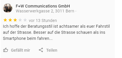 Kürzlich wurden wir selbst "Opfer" einer unwahren Rezension. Auf unserem Google My Business-Profil haben wir folgende Bewertung vorgefunden: